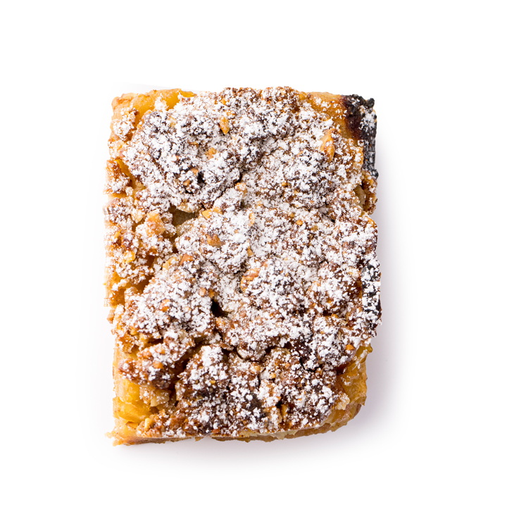 Apfel (66%), Dinkelcrumble (26%) (DINKELMEHL, brauner Zucker, BUTTER, WALNÜSSE, geriebene geröstete HASELNÜSSE, Malzextrakt (GERSTENMALZ, Wasser), jodiertes Speisesalz (Speisesalz, Kaliumjodid)), DINKELMEHL, BUTTER, Zucker, HÜHNEREIGELB, Säuerungsmittel: Zitronensäure; Backpulver (Backtriebmittel: Diphosphate, Natriumcarbonate, Calciumsulfat; Trennmittel: Calciumcarbonat), jodiertes Speisesalz (Speisesalz, Kaliumjodid)