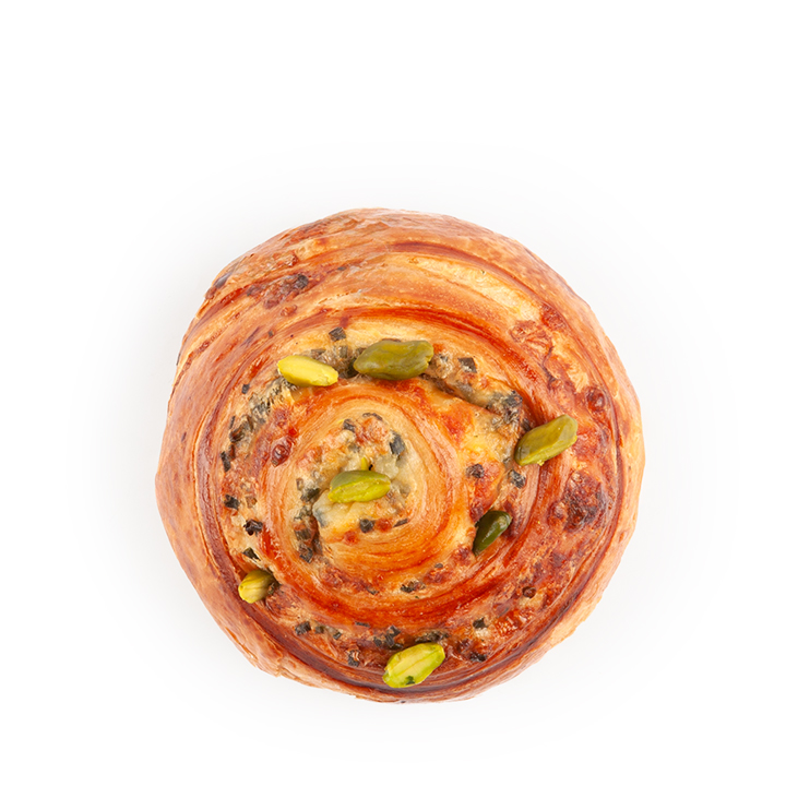 Herzhafte Croissantrolle aus zartblättrigen Croissant-Teig mit aromatisiertem Schnittlauch und würzigem Käse. Bestreut mit knackigen Pistazien – perfekt für alle, die es gerne deftig genießen.