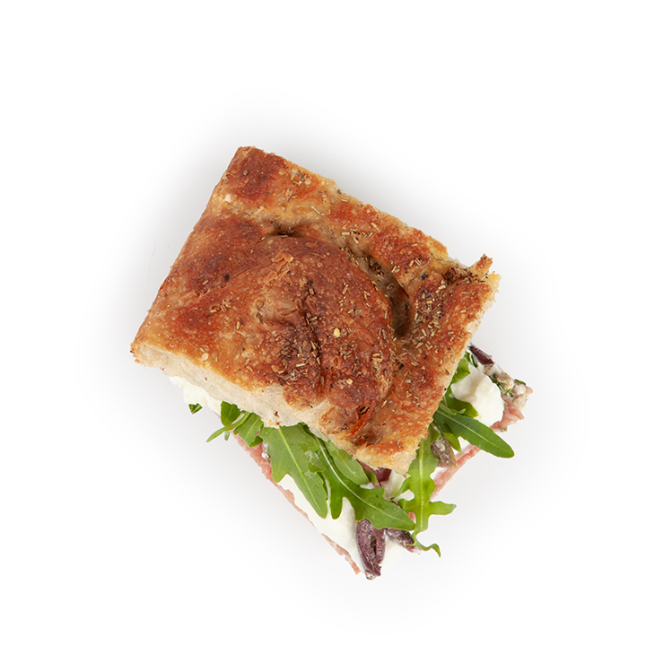 Focaccia (Wasser, Pizzamehl (WEIZENMEHL, WEIZENKEIMMEHL), WEIZENMEHL, Kartoffelflocken, Olivenöl, Rosmarin geschnitten, jodiertes Speisesalz (Speisesalz, Kaliumjodid), Backhefe, ROGGENMEHL, Backmittel (WEIZENMEHL, Zucker, WEIZENKLEBER, WEIZENQUELLMEHL, WEIZENMALZMEHL, Malzextrakt (GERSTENMALZ, Wasser)), Bäckerstreusalz (Speisesalz unjodiert)), Frischkäse 40% F.i.T (Mozzarella-Käse, SAHNE, Salz), Rucola, Salami (5,26%) (Schweinefleisch, Speck, Nitritpökelsalz, Dextrose, Gewürze, Stabilisator: Diphosphate; Antioxidationsmittel: Rosmarinextrakt, Natriumascorbat, Ascorbinsäure; Farbstoff: echtes Karmin; natürliches Aroma, Gewürzextrakte, Rauch), Mayonnaise 50% Fett (Rapsöl, Wasser, HÜHNEREIGELB, Zucker, Weingeistessig, modifizierte Maisstärke, Gewürze, Speisesalz, Säuerungsmittel: Apfelsäure, Milchsäure; Konservierungsstoff: Sorbinsäure; Verdickungsmittel: Xanthan, Guarkernmehl), pflanzliches Öl (Raps- und Sonnenblumenöl in veränderlichen Gewichtsanteilen), Oliven in Scheiben (geschwärzte Oliven in Scheiben geschnitten, Wasser, Salz, Säuerungsmittel: Milchsäure; Stabilisator: Eisengluconat), Olivenöl, Frischkäsezubereitung 70% F.i.T (FRISCHKÄSE, MOLKENEIWEISS, Speisesalz), Basilikum, Knoblauch, Grana Padano 32% F.i.T (MILCH, Salz, Lab, Konservierungsstoff: Lysozym (aus EI)), jodiertes Speisesalz (Speisesalz, Kaliumjodid), Gewürzmischung (Salz, Gemüse, Maltodextrin, Zucker, Sonnenblumenöl, Kräuter, Gewürze)