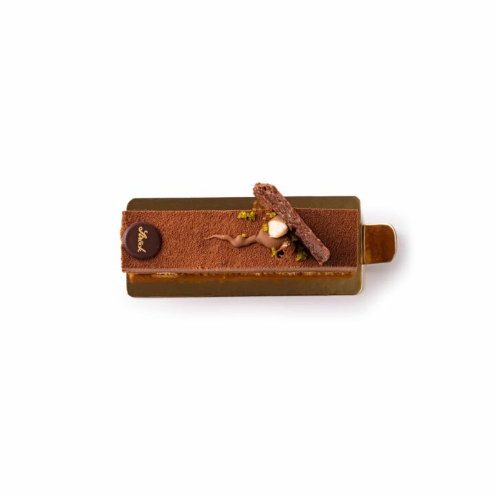 Schokoladenbiskuit, knuspriges Nougat, dunkle Schokoladencreme und Haselnüsse
